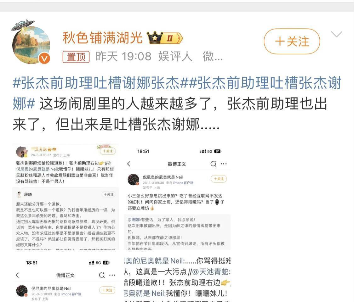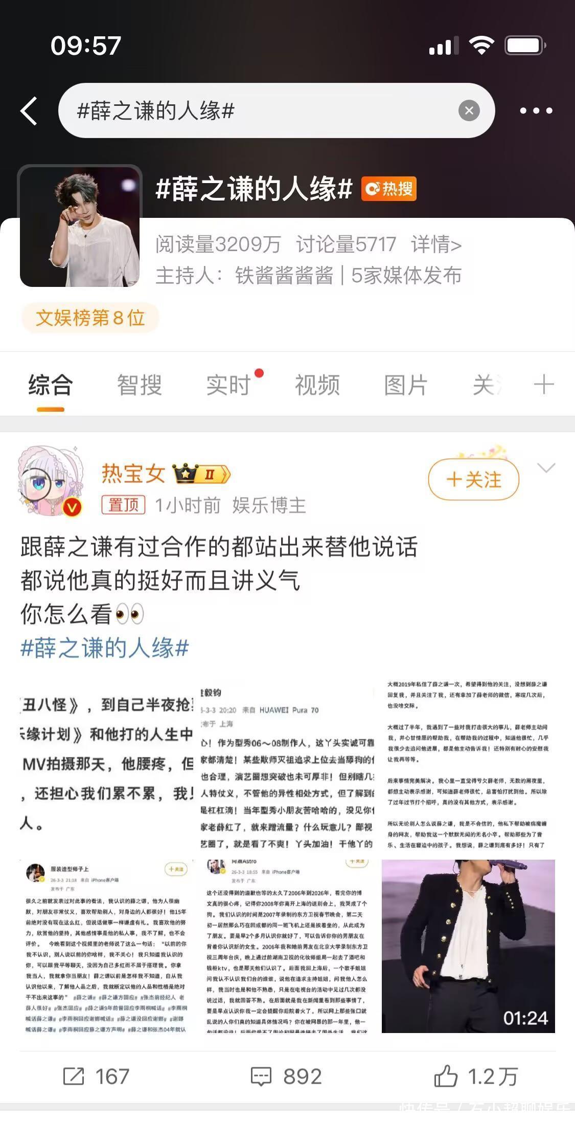 后面薛之谦参加过《吐槽大会》曾经有“四不”发言(未点名但被全网关联张杰),被指引导舆论给张杰贴上“软饭男”标签。导火索已经埋下。这次李雨桐的发文,紧接着谢娜发文,让薛之谦和张杰的恩怨再次被放在台面上。再然后张杰前女友段曦控诉:指张杰恋爱期间出轨,分手后自己遭多年网暴(如“掌掴谢娜”谣言),代言被撤,斥张杰未替其澄清。她力挺薛之谦“重情重义”,质疑谢娜双标。二、舆论的天平也慢慢向薛之谦方倾斜:“薛之谦的人缘”上热搜。
